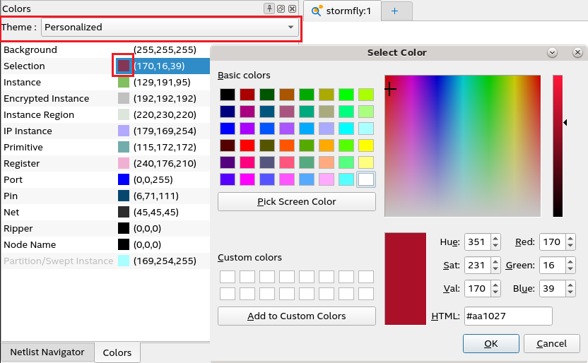 - When you select an object in the schematic viewer, the object is automatically color-coded based on the colors specified in the Colors pane. If you want to modify the colors or the schematic viewer background (white or black), go to Tools > Color Settings. In the Theme drop-down menu, you can switch between black and white background. To modify the object color, double-click on the respective color box. The Select Color dialog box displays. Select the desired color and click OK.