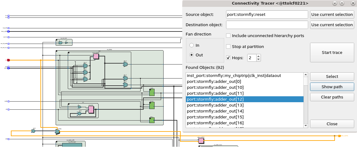 In the following image, the source object is the reset port. The Found Objects field lists several fan-out nodes when you trace the fan-out cone. When you select and view port::stormfly::adder_out[12], the path is highlighted in the schematic viewer showing the fan-out cone.