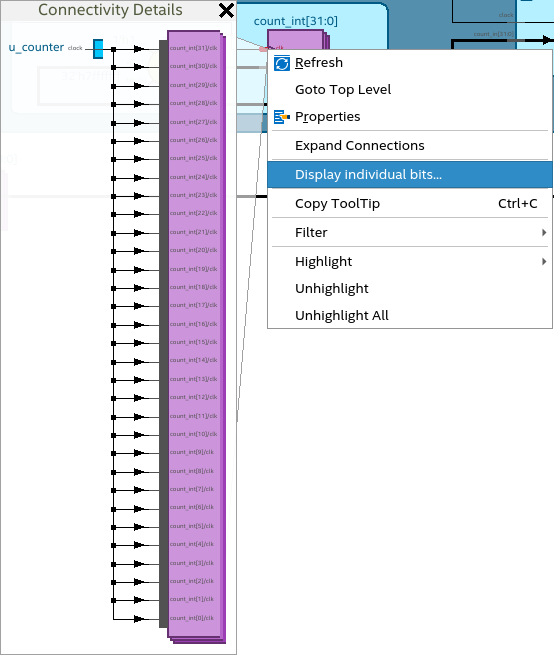 If you want to view individual bits of a bundled instance within the schematic viewer, select the pin bus, right-click to display the context-sensitive menu, and click Display Individual Bits. The Connectivity Details dialog displays connectivity details of the single-bit instances.