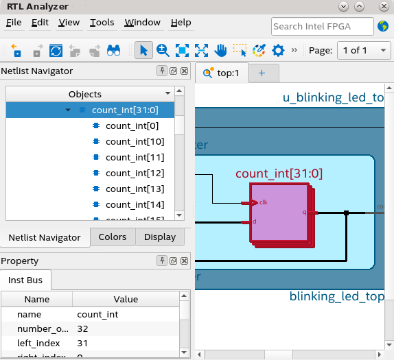 In the following figure, count_int[31:0] is a bundled instance, where 31 is the left index and 0 is the right index. Under the Objects pane (hierarchy browser), count_int[0], count_int[10], count_int[11], and so on are single-bit instance members.