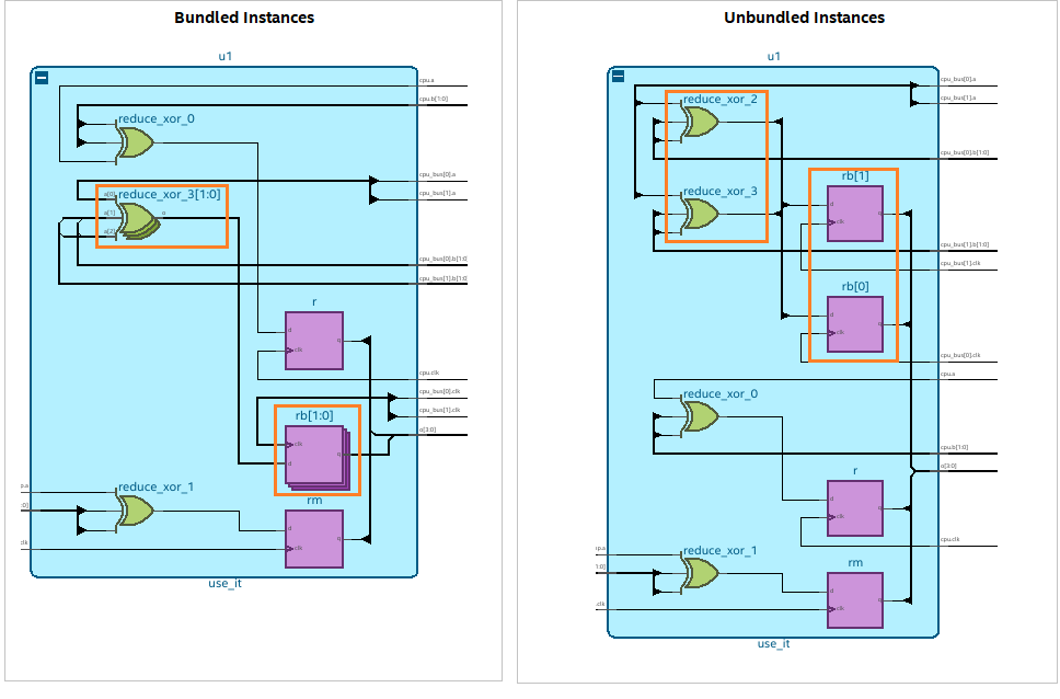 In the following example, when you view the design in the default no interface mode (left), you observe that the instances reduce_xor_3[1:0] and rb[1:0] are bundled. However, within the unbundle instance mode (right), you can view single-bit instances reduce_xor_3, reduce_xor_2, rb[1], and rb[0].