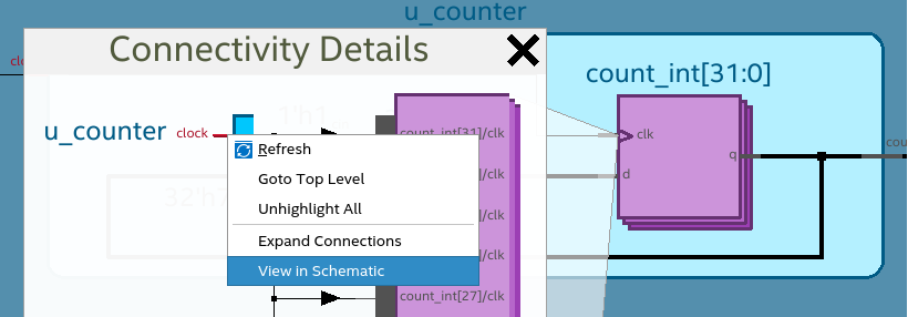 Within the Connectivity Details dialog box, you can select the first individual instance, right-click to display the context-sensitive menu, and select View in Schematic. The first object in the hierarchy gets highlighted automatically.