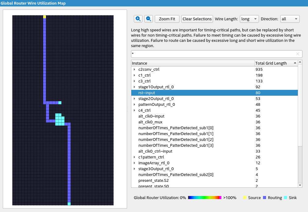 The Global Router Wire Utilization Map offers a visual representation of the Global Router Congestion Hotspot Summary Report, presenting global signal routing via an interactive heat-map. The map illustrates the routing utilization rate of both long and short routing wires, offering a detailed view of all nets in the design. The heatmap grid corresponds to the LABs available in the device, with color ranging from blue to red, indicating routing utilization rates from 0% to 100%. Pink color denotes utilization rates exceeding 100%.