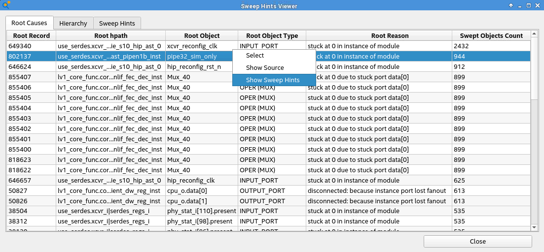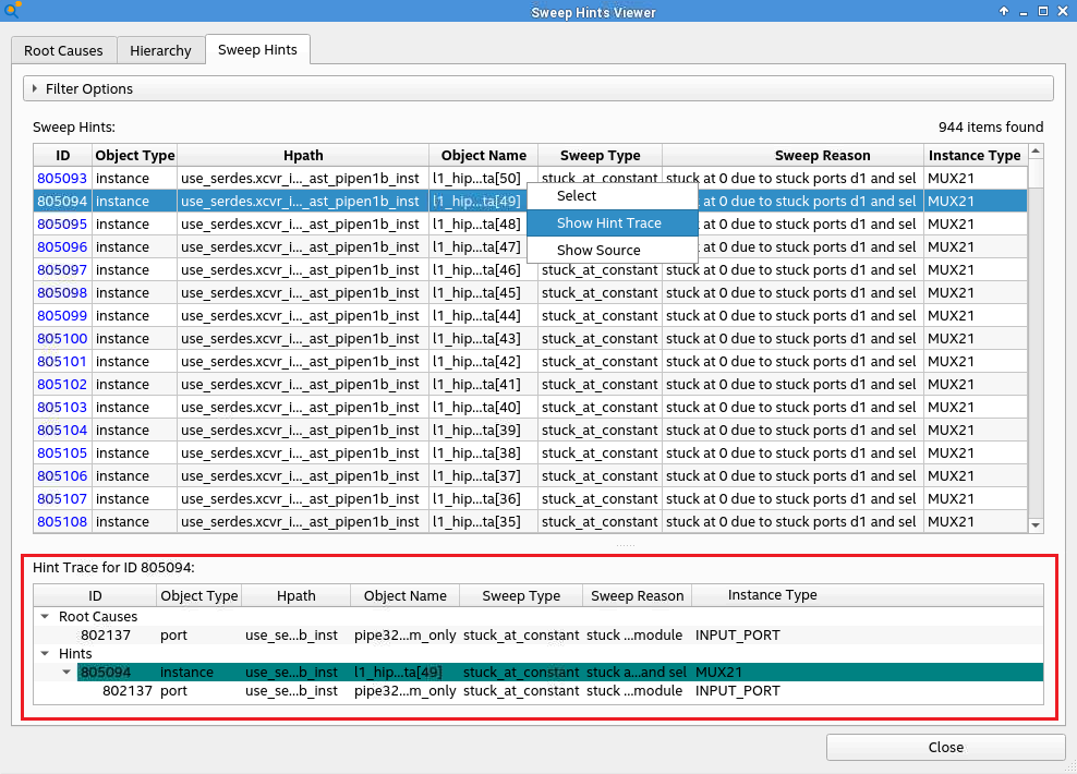 Recall from the Design Analysis & Elaboration how to sweep optimization (Swept checkpoint) happens as part of the Analysis & Elaboration stage. The sweep optimization phase leaves behind a database of objects that are swept away along with the reason for their removal. The database also tracks relationships between the removed objects. For example, if an output of a gate is dangling, it is swept away. Few cells in the fan-in cone can also be swept away because their output does not drive anything useful. The Sweep Hints Viewer allows you to view the sweep hints database with a list of marked objects in the pre-swept design that are removed later.