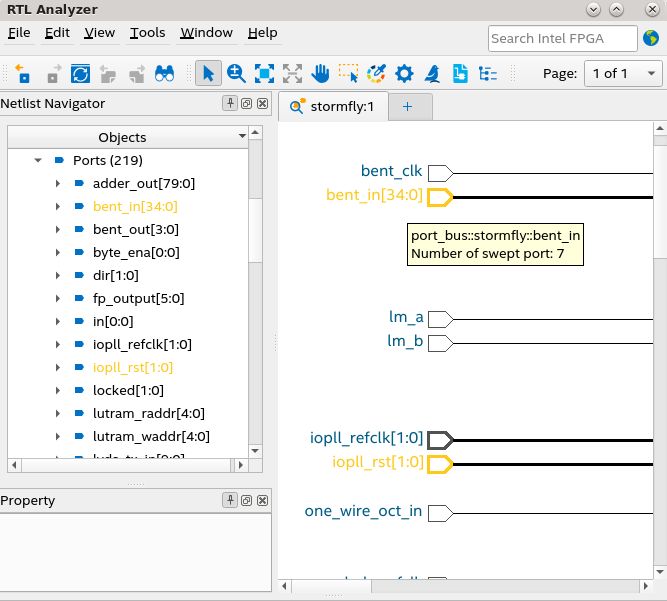 The RTL Analyzer highlights the top-level module port and leaf instance with associated sweep hints in orange color. When you hover over the swept port or instance, the tooltip displays the number of swept ports, sweep hint type, and sweep hint reason. These highlights and tooltips are available in both the schematic view and the Netlist Navigator, as shown in the following image: