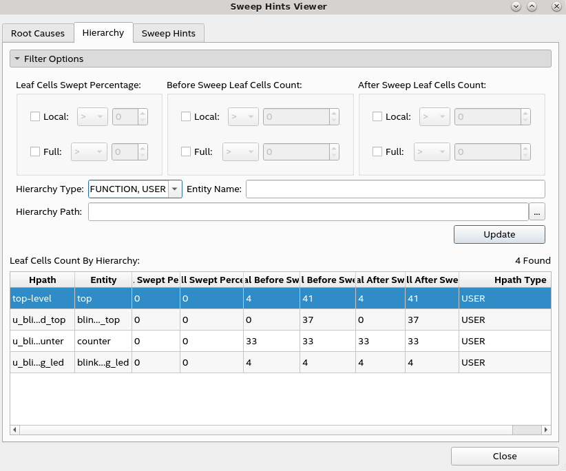 The Leaf Cells Count by Hierarchy table in the above image provides information about the percentage of the logic swept either locally or in the full hierarchy of a given hierarchical path. The table columns for the number of leaf cells indicate before and after a sweep and the type of hierarchical path, which can be USER (RTL you designed), Intel® IP, or MEGAFUNCTION ( Intel® -provided library modules). If the hierarchy table is large, use the filter options to refine the regions of your design.