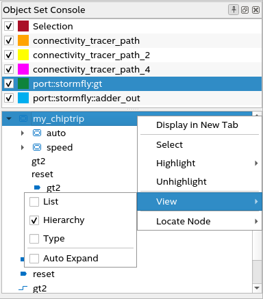 When you select one of the nodes in the top pane, the bottom pane displays a tree or list view of all netlist objects (ports, instances, instance ports, and nets) that are part of that node. Using the context-sensitive menu, you can select and view the desired node in a new tab within the schematic viewer and highlight/unhighlight the path with a different color.