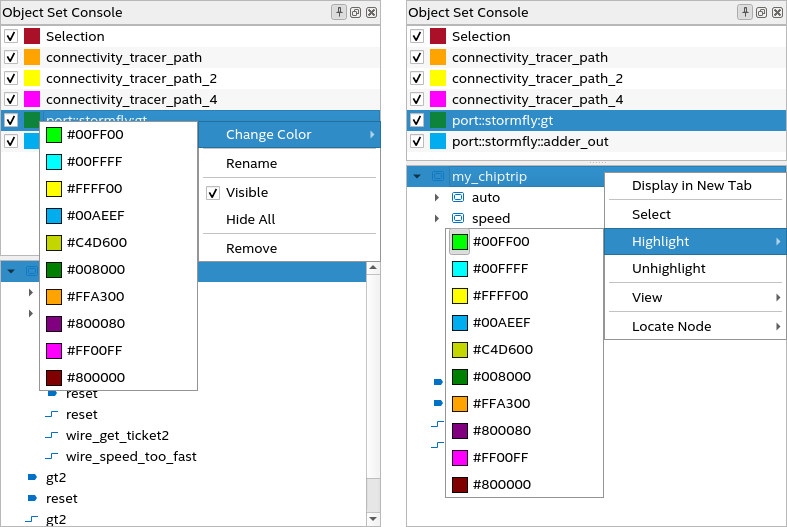The top pane displays the design's currently selected, highlighted, or colored nodes.