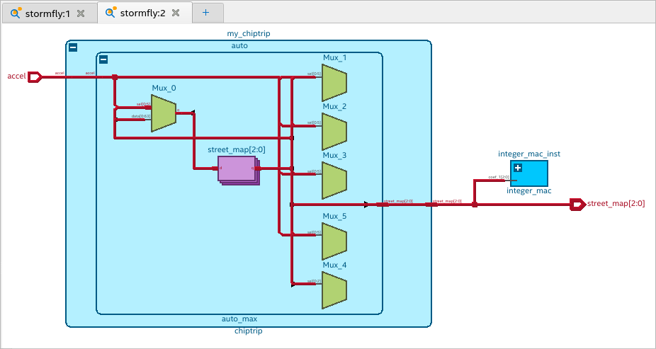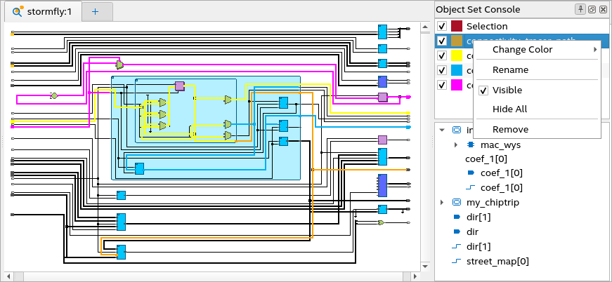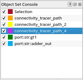 Consider an example where you traced fan-in or fan-out connectivity of your design. When you view a specific traced path, it gets highlighted in the schematic viewer. When you click Show Path for one or more traced paths, the top pane lists all paths in different color codes, as shown in the following image:
