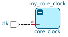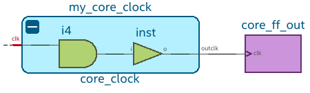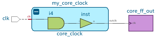 - Between Selected Objects: Displays nodes and connections in the path between the selected ports. In the following image, when you use the Between Selected Objects filter for the selected instance port clk, all objects between the input and output instance ports displays: