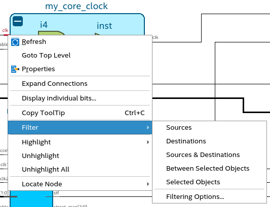 You access the Filter feature either from the netlist hierarchy browser or the schematic viewer of the RTL Analyzer GUI. Select and right-click on the desired design object (port or node), point to Filter, and select the desired filter command in the context-sensitive menu, as shown in the following image. The RTL Analyzer generates a new page in the schematic view displaying the netlist that remains after filtering.
