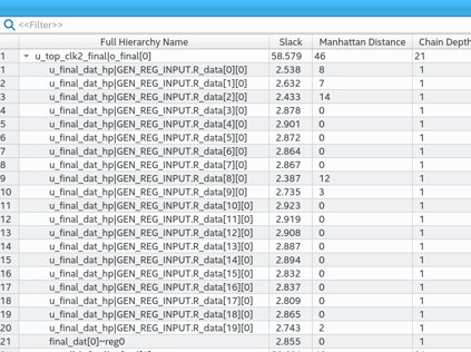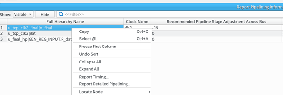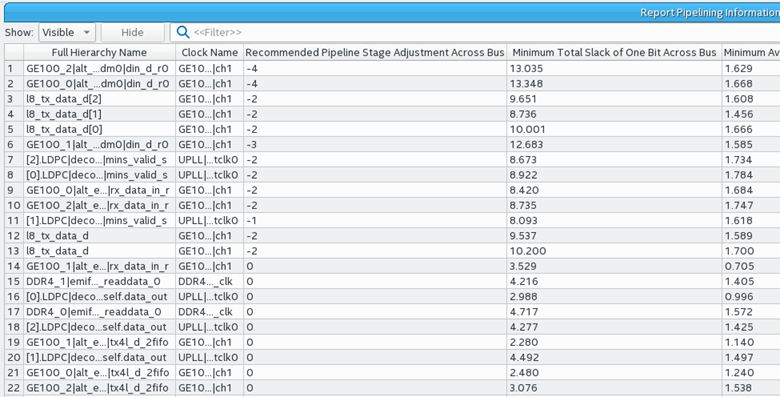 The Recommended Pipeline Stage Adjustment Across Bus reports the number of registers that you can remove from the bus for each bit. The Average Distance Per Stage, Max Distance Per Stage, and Min Distance Per Stage columns report the Manhattan distance measured in logic array blocks (LABs). The Bus Average Depth, Bus Max Depth, and Bus Min Depth columns report the number of sequential, single fan-out registers. For registers that have more than one clock source, the report lists the fastest one.
