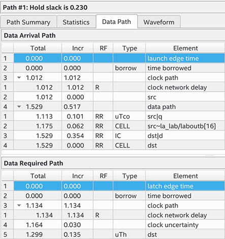 The following shows the hold report for this example in the Timing Analyzer and highlights the launch and latch edges.