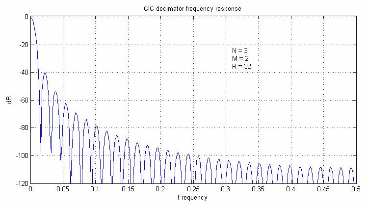 Figure 6. Three-stage CIC Decimation Filter Frequency ResponseCIC decimation filter with N = 3, M = 2 and R = 32
