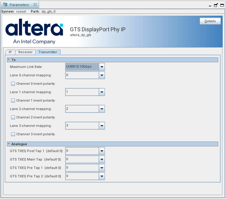 GTS DisplayPort PHY IP Parameter Editor Settings
