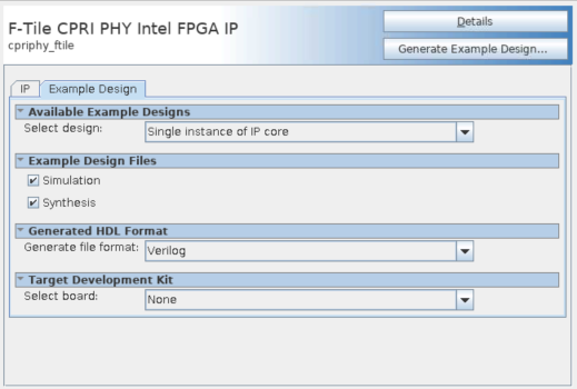 Example Design Tab in IP Parameter Editor