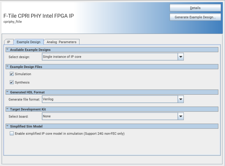 - Under Example Design Files, select the Simulation option to generate the testbench and the compilation-only project. Select the Synthesis option to generate the hardware design example. You must select at least one of the Simulation and Synthesis options to generate the design example.