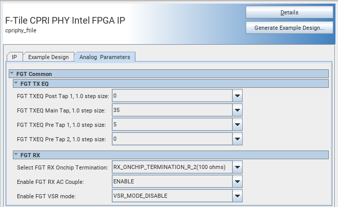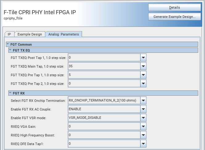 | FGT RX Onchip Termination | RX_ONCHIP_TERMINATION_R_2 (100 ohms) |