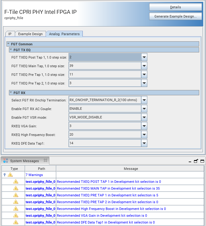 In the Example Design tab, if you select Target Development Kit to be Intel Agilex 7 FPGA I-Series Transceiver-SoC Development Kit, and you configure analog parameters other than the default and recommended values, you will see warnings to recommend you set to the default values.