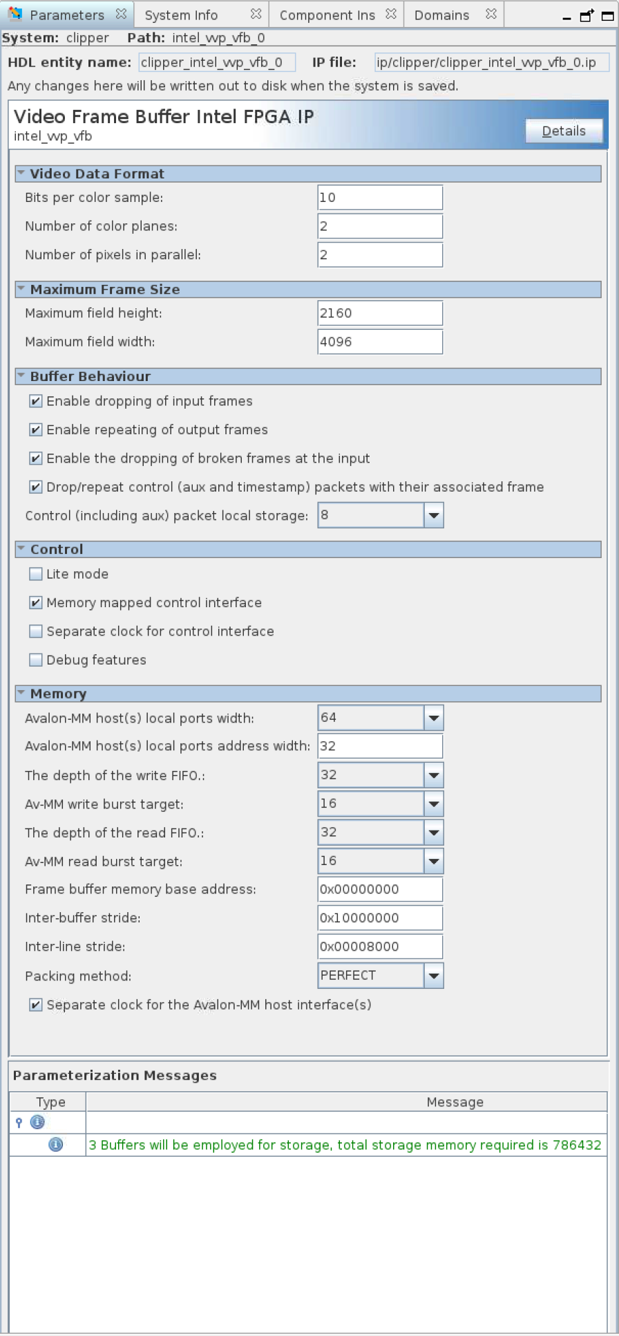 Separate clock for the Avalon memory-mapped host interface(s) | On or off | A separate clock allows the control and data portions of the frame buffer to run at their maximum clock frequencies. Turn on separate clocks for highest performance. |
