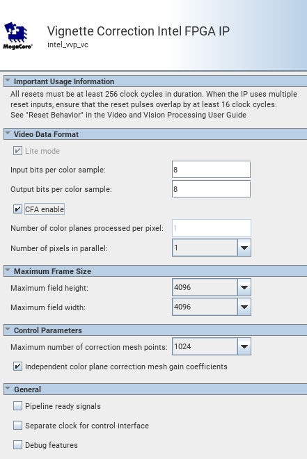 Maximum number of correction mesh points | 1024, 2048, 4096 | Limits the maximum number of correction mesh points. The IP supports arbitrary V x H rectangular correction meshes, where valid values of V and H range from 8 to 512 in 1 step increments. You must set this parameter to more than or equal to the mesh size V x H you intend to use. You program the values of V and H during runtime via the control interface. |