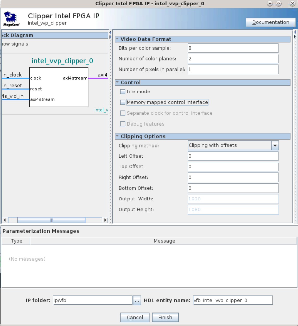 Memory-mapped control interface | On or off | Turn on to specify clipping offsets using the Avalon memory-mapped interface. You must have the Avalon memory-mapped control agent interface if you turn on Lite mode. |