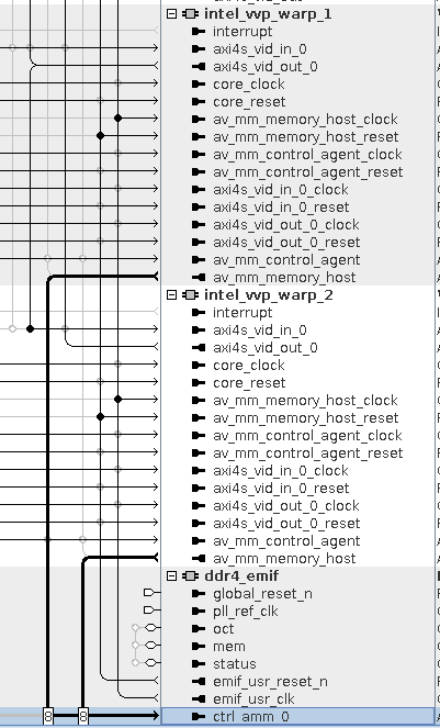 - Set the arbitration weighting at the front end of the DDR4 EMIF to 16:1 in favor of the Warp IP (versus the processor and the Frame Buffer’s read and write interfaces connected through the mm_vfb_bridge component).