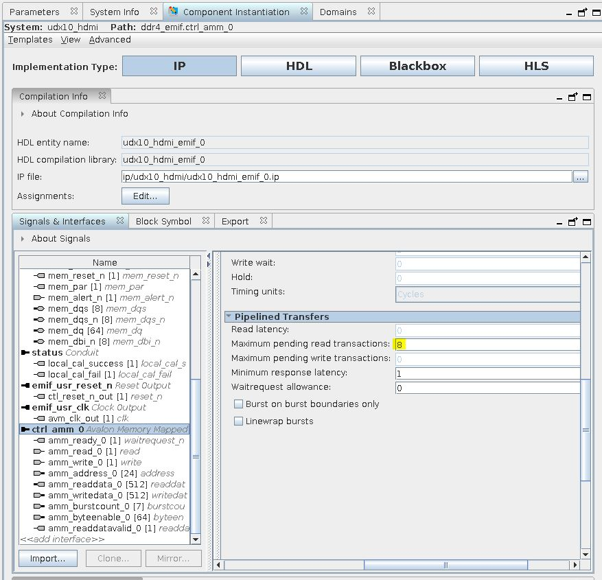 - Set the Maximum pending read transactions parameter in the pipelined transfers section of the Avalon memory-mapped ports to be at 8.
