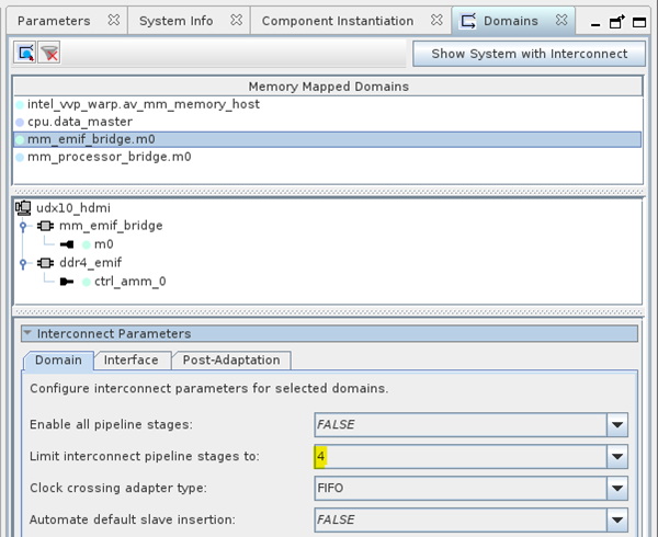 - Set Limit interconnect pipeline stages to for the domain at the front end of the DDR4 EMIF to 4. This limit helps to meet timing on the memory interface clock domain.