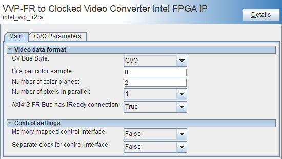 CV Bus Style | Lite, CVI or CVO | Select which sideband signals the IP drives, and which signals are available in Platform Designer. A second tab allows configuration of the CV bus style. |