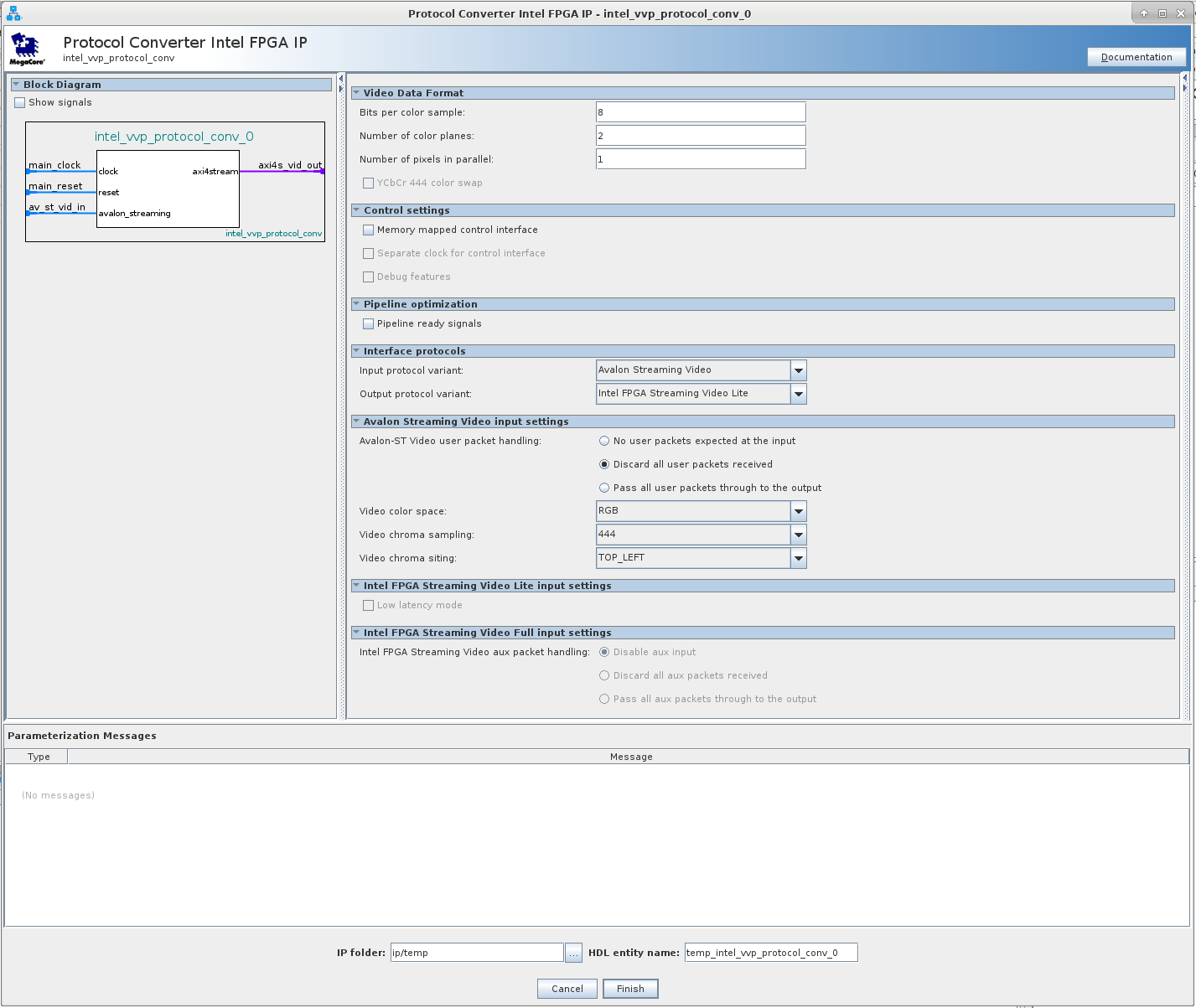 Input protocol variant | Avalon Streaming Video, Intel FPGA Streaming Video Full, or Intel FPGA Streaming Video Lite | Select the protocol for the input interface |
