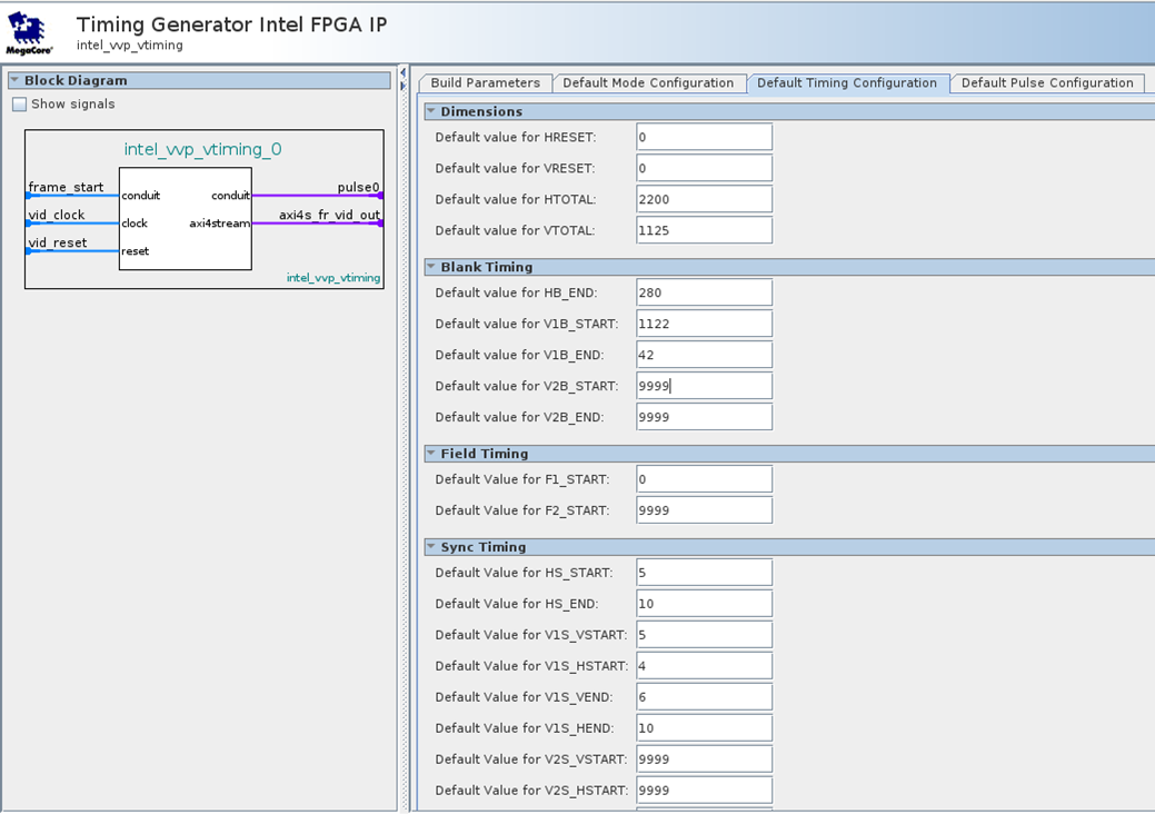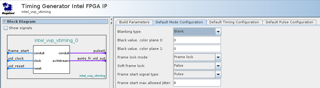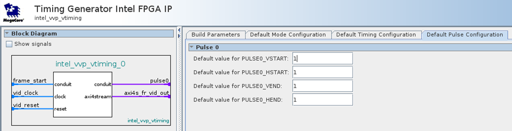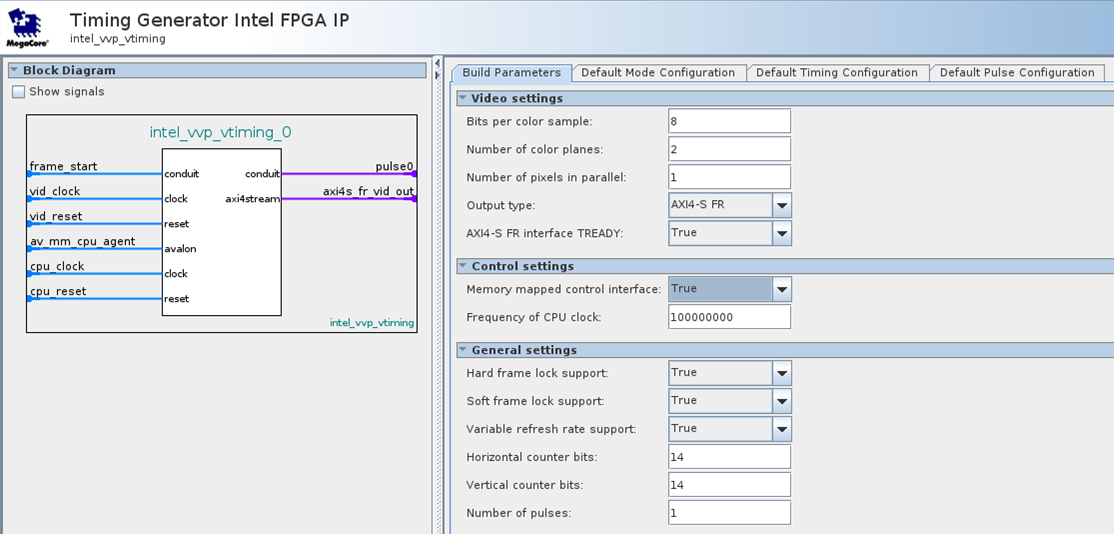 Number of pulses | 0 to 8 | The number of additional general-purpose pulses that the IP can produce. Each additional pulse increases the gate count of this IP. If 0, the Default Pulse Configuration GUI is off. |