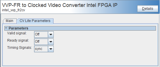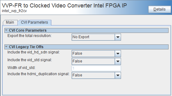 CV Bus Style | Lite, CVI or CVO | Select which sideband signals the IP drives, and which signals are available in Platform Designer. A second tab allows configuration of the CV bus style. |