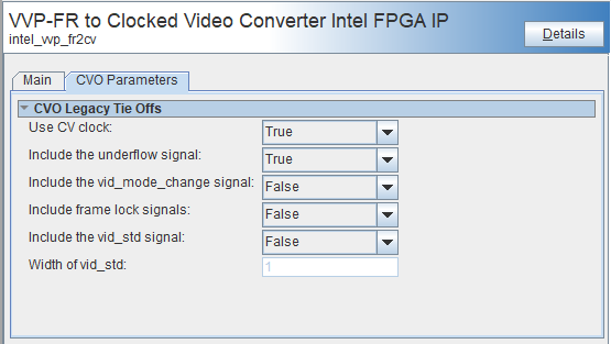 Include the underflow signal | True or False | Select True to add this signal to the cv_vid_out conduit. The signal has no function within the IP and is included for connectivity within Platform Designer. |