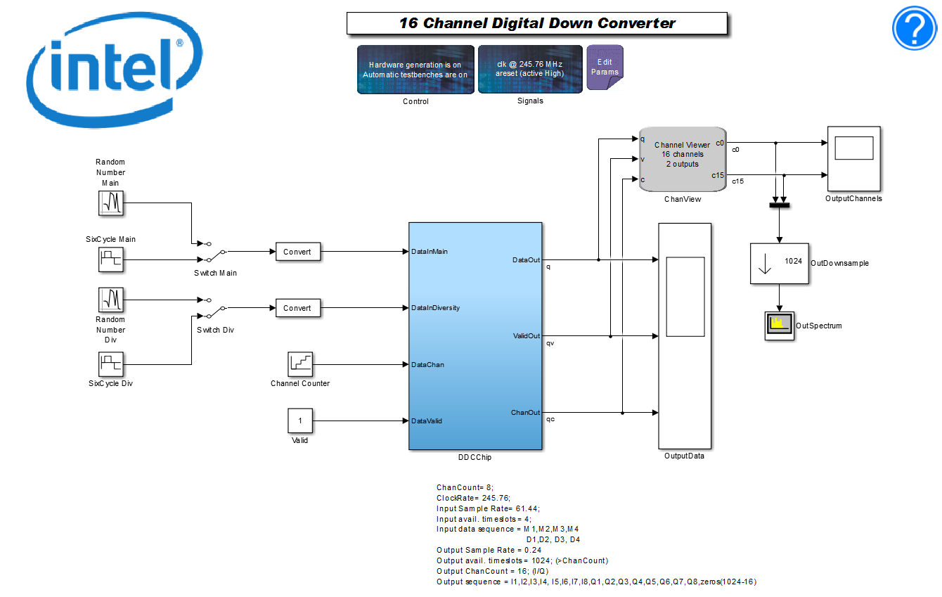 Intermediate frequency (IF) modem designs have multichannel, multirate filter lineups. The filter lineup is often programmable from a host processor, and has stringent demands on DSP performance and accuracy.The DDC design example is a high-performance design running at over 350 MHz in an Intel Arria 10 device. The design example is very efficient and at under 4,000 logic registers gives a low cost per channel.