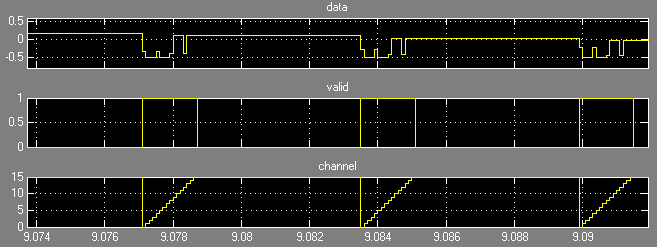 Bursts of data occur, with 16 contiguous samples followed by a gap. Each burst is tagged with the valid signal. Also the channel indicator shows that the channel order is 0..15.