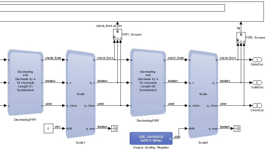 The last part of the DDC datapath comprises two decimating finite impulse response (FIR) blocks (DecimatingFIR1 and DecimatingFIR2) and their corresponding scale blocks (Scale1 and Scale2).