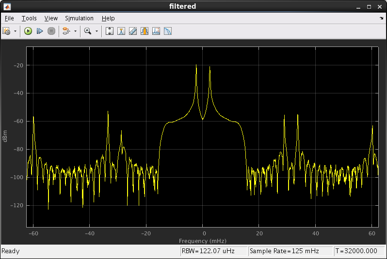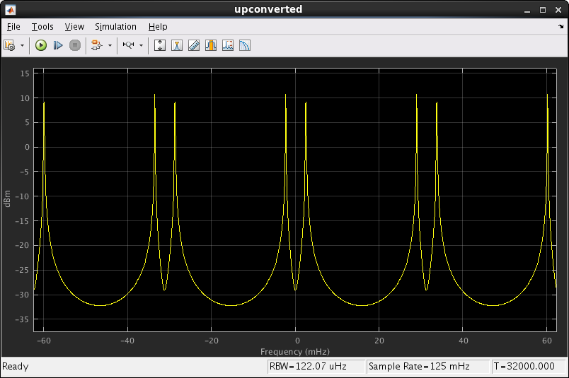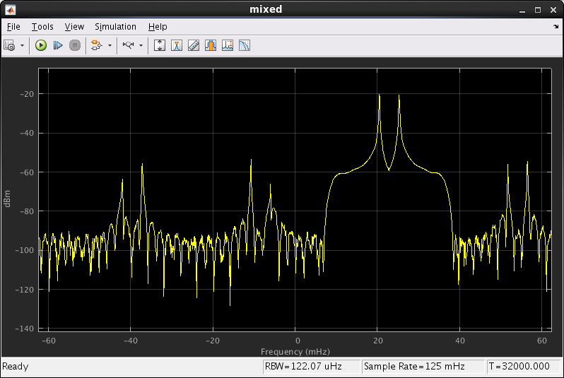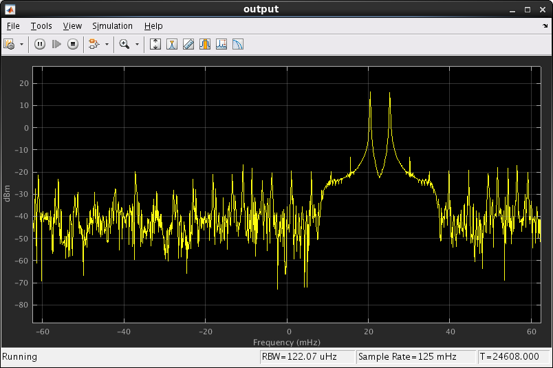 The mixed spectrum shows the baseband signal moving over to be centered on 16 MHz. This view shows the Simulink clock rate of 1 Hz rather than the FPGA clock rate of 640 MHz, so 16 MHz becomes 25 mHz.