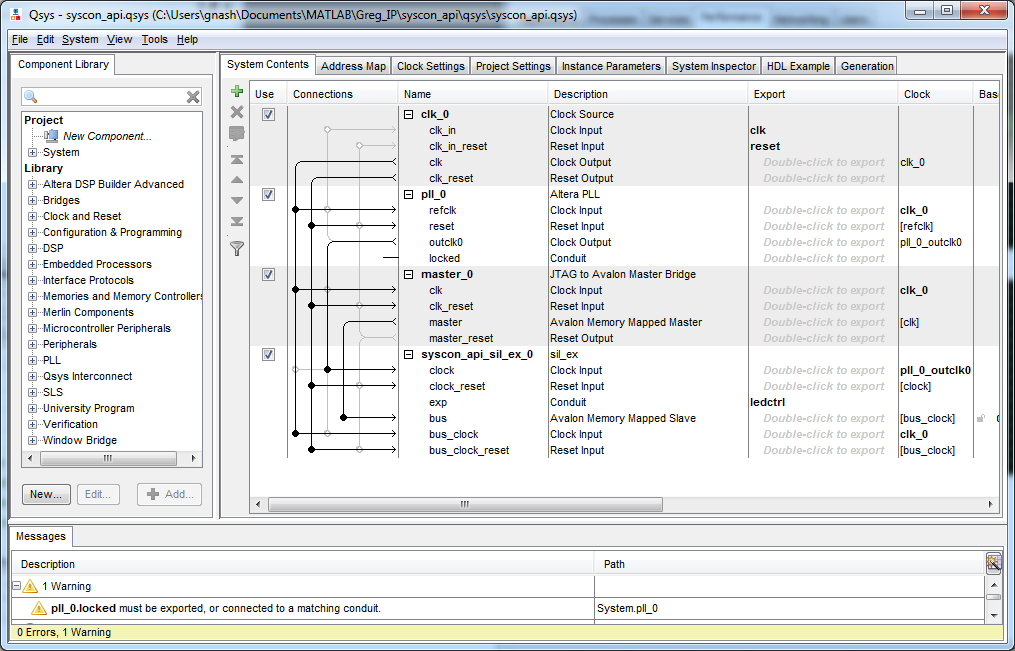 Figure 28. Platform Designer System master_0 is the instance of JTAG debug master. syscon_api_sil_ex_0 is the instance of the top-level DSP Builder system, which contains test buffers.