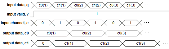 c Input Indicates the channel of the data input signals. If v is high, c indicates which channel the data corresponds to.