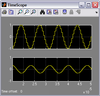You can use the FractionalRateFIR block in a digital down converter for a radio system or a general purpose DSP application. The coefficients and input data are fixed-point types, and the output is the implied full precision fixed-point type. You can reduce the precision by using a separate Scale block, which can perform rounding and saturation to provide the required output precision.