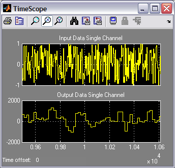 You can use the DecimatingCIC block in a digital down converter for a radio system or a general purpose DSP application. The coefficients and input data are fixed-point types, and the output is the implied full-precision fixed-point type. You can reduce the precision with a separate Scale block, which can perform rounding and saturation to provide the required output precision.