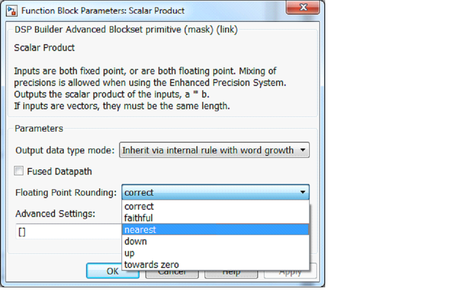 When you turn on Fused datapath, you can select only the rounding modes Nearest and Towards zero. Logic utilization is highest when your design uses rounding mode Nearest.