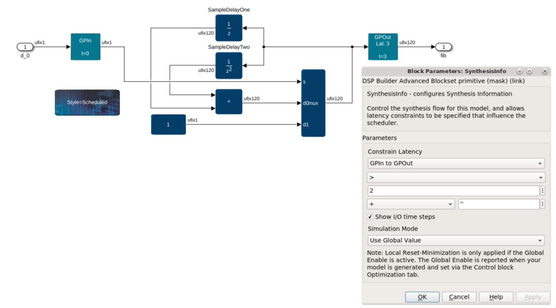 The Scheduled style of operation uses a pipelining and delay distribution algorithm that creates fast hardware implementations from an easily described untimed block diagram. This style takes full advantage of the automatic pipelining capability. - Updated Help