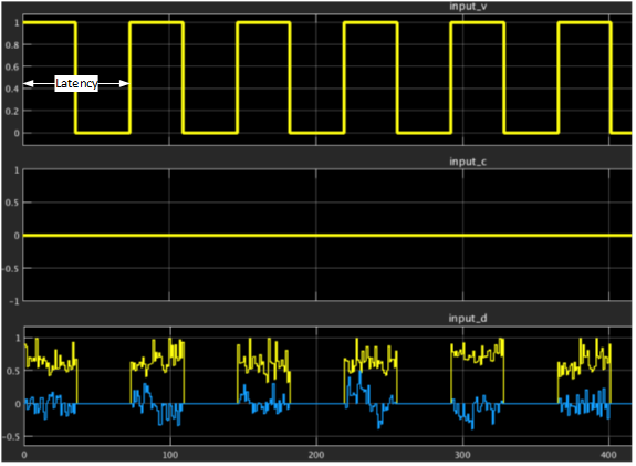 The figure shows the latency configuration parameter in the input interface including data, valid, and channel signals. In this example of 8x8 matrix inversion, the valid signal remains high for 36 clock cycles (total number of lower triangle elements of the Hermitian matrix of 8x8) and remains low for (latency – 36) cycles before inserting the next matrix elements. The minimum duration to remain low and hence the minimum latency period may vary depending on the matrix size and the pipelining required to meet timing constraints.
