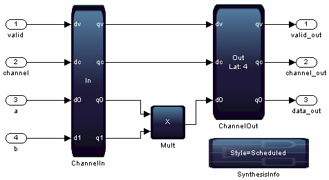 Similarly, if you have insufficient user-inserted delay to meet the required fMAX, DSP Builder automatically pipelines and balances the delays, and then corrects the cycle-accuracy of the primitive subsystem as a whole, by delaying the output signals in simulation by the appropriate number of cycles at the ChannelOut block.