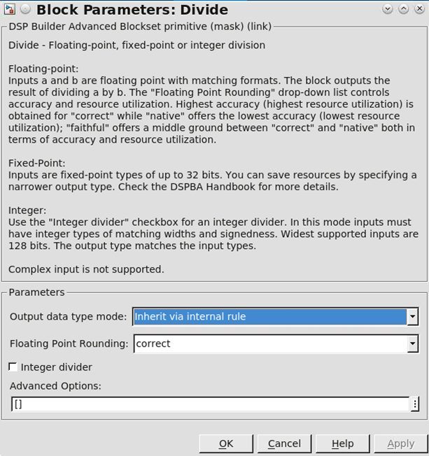 DSP Builder instantiates a floating-point divider if inputs a and b are both floating-point with matching formats. You can configure the block to perform a correctly rounded, round-to-nearest tie-breaks to even division as specified by the IEEE-754 standard by selecting correct from Floating-Point Rounding under Parameters.