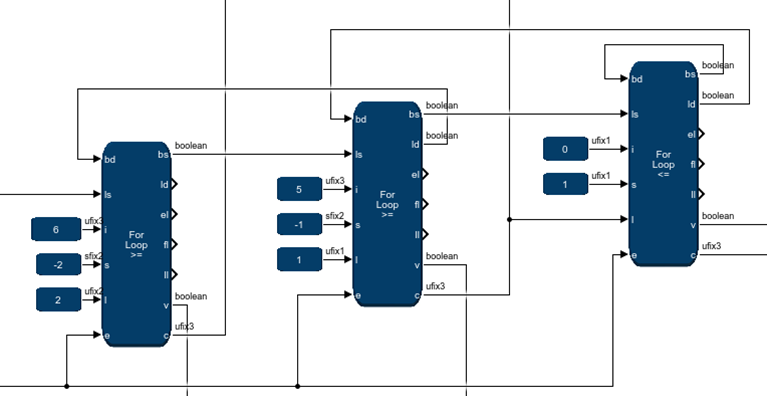 Instantiates a ForLoop block <name> and inequality operator set to <, <=, >, or >=. The values that you specify for <init>, <step>, and <limit> drive the input ports of the ForLoop block.