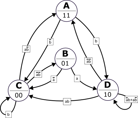 This example state diagram has two inputs: a, b; and two outputs: q1, q0. Negations are (~x), conjunctions (x & y), and disjunctions (x | y). The output values for ports, q1 and q0, are at the end of the if statements