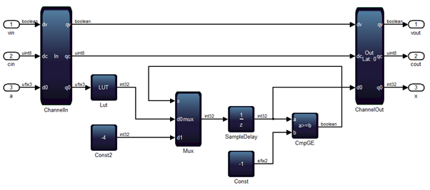 Control units that use this design methodology are also robust to optimizations that alter the latency of components. For example, when a LUT block grows sufficiently large, DSP Builder synthesizes a DualMem block in its place that has a latency of at least one cycle. Automated delay balancing inserts a sufficient number of one bit wide delays on the valid signal control path inside every Anchored Delay. Hence, even if the CmpGE block is registered, its reset state has no influence on the initial state of the control unit when the valid-in first goes high.